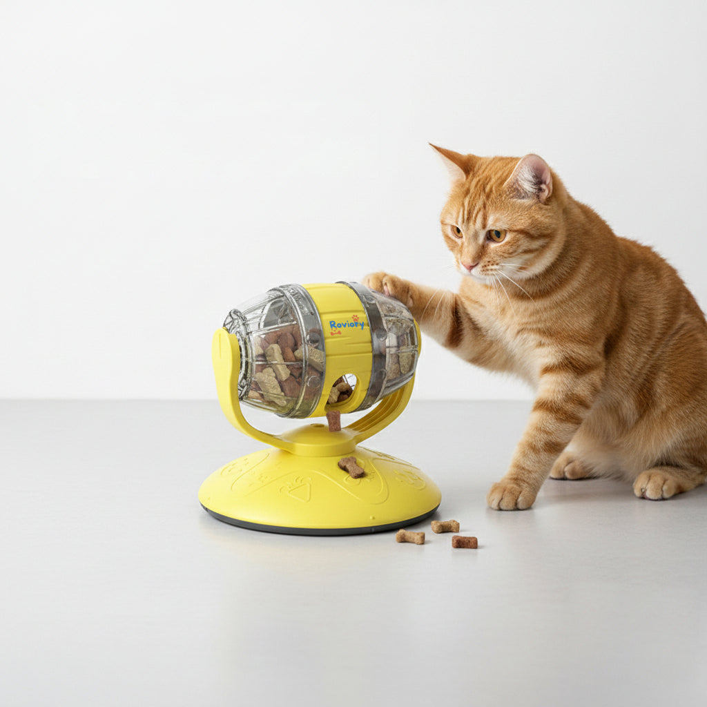 Barrel-Themed Slow Feeder: The central "beer barrel" acts as a smart treat dispenser. As your cat bats at the barrel, it rotates to release dry food or treats, effectively slowing down fast eaters and aiding digestion.